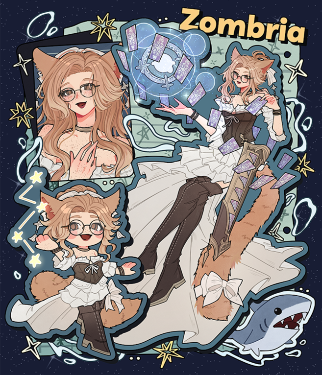 Background:Zombria doesn’t remember much about the faces of her birth parents—only the sound of waves and the smell of salt in the air when she was first found. What followed was a childhood in the cold halls of a noble Ishgardian family, one that had adopted her not out of kindness, but out of calculation.Her new “parents” took Zombria in as a form of social and economic leverage. A child of foreign blood with an exotic lineage made for excellent optics at banquets, and even better political maneuvering in the growing markets of Limsa and beyond. Every lesson she was given, every meal, every new robe, came with an unspoken price tag. To them, affection was transactional, and potential was only valuable if it translated into profit.Zombria saw the world differently. She wasn't interested in ledger books or high-society games. What captivated her were the stars through her frost-covered window, the sea charts she stole glances at in her adoptive father’s office, and the mysterious, glowing creatures described in forbidden tomes and sailor tales.Using her budding talent as an Astrologian, she became a courier, traveling from port to port on trade ships, guiding crews safely across treacherous waters by reading the night sky. Zombria became a living map, navigating not just routes—but her own identity.But even that life lost its luster. She no longer wanted to serve business. She wanted to help people—really help them. Her dreams of studying the oceans and understanding the strange, magical ecosystems below the surface only grew stronger with each passing voyage.Now, with her star globe on her back and her journal at her side, Zombria travels not for coin, but for purpose. Whether it’s healing war-torn villages in Garlemald, aiding scholars in Sharlayan, or diving into the forgotten depths off the coast of Doma, she’s charting her own path—one not drawn in ink, but in starlight.